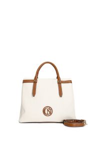 Borsa con manici tubolari in materiale canvas con logo a contrasto e dettagli in smalto chiusura con tramezza zip rifiniture eleganti e tracollina removibile.