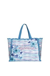 Borsa mare in tessuto stampato con frange decorative manici a nastro in contrasto e fodera interna unita. pratica e leggera perfetta per le tue giornate estive.