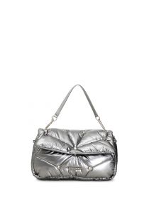Morbida borsa a spalla in nylon dall'effetto metallizzato con trapuntatura irregolare e borchie esagonali da portare a spalla con catena