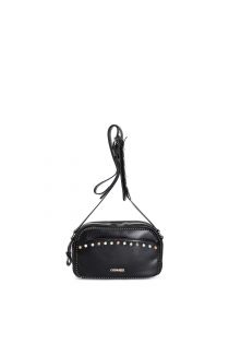 Camera bag compatta con tasca frontale decorazioni in pietre cabochon e mini rivetti. spallaccio impreziosito per un look elegante e funzionale.
