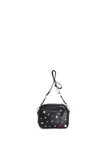 Camera bag con applicazioni di rivetti a soggetto. doppio scomparto e doppia cerniera. tracolla removibile.