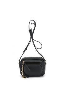 Camera bag con tasche frontali e charm personalizzato in metallo. unico scomparto e taschino interno con zip. chiusura con cerniera.