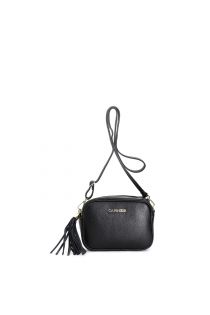 Camera bag in pelle martellata con tracolla con moschettoni e nappina. chiusura con cerniera.