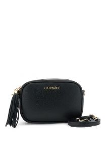 camera bag in pelle martellata con tracolla, moschettoni e nappina nero