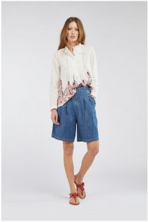 Camicia tipo caftano in mussola di cotone impreziosita da un particolare ricamo al fondo. Un gioco di impunture e lievi arricciture creano un delicato movimento.