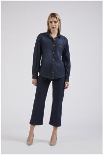 Camicia in tela denim leggera con maniche arricciate. placchetta personalizzata per rifinire il taschino.