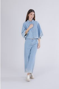 camicia croopped in jeans con ricamo alle maniche celeste