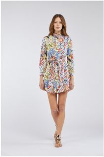 Camicia lunga con colletto alla coreana valorizzata da tagli e leggere arricciature in vita che donano movimento e agio nella vestibilità. Disponibile in tre stampe fantasia esclusive.