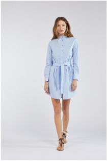Camicia lunga in popeline con colletto alla coreana valorizzata da tagli e leggere arricciature in vita che donano movimento e agio nella vestibilità.