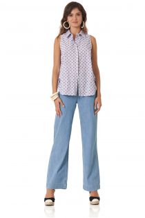 Particolarissima camicia smanicata in popeline di cotone rigato e fil coupè. Le balze dietro in tessuto a conferiscono un gusto frizzante e originale, mentre il taglio con inserto a triangolo laterale amplia la vestibilità e rende il capo adatto a diverse conformazioni fisiche.