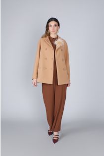 Cappotto corto doppiopetto con manica raglan e linea essenziale. arricchito da una spilla con piuma unisce comfort e stile per un look casual raffinato e di tendenza. vestibilità regular. la modella è alta 173 cm e indossa la taglia s.