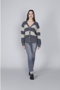 Cardigan a righe con scollatura a "v" realizzato in morbido filato mistolana con dettagli in lurex. caldo e versatile perfetto per look casual e sofisticati. vestibilità regolare. la modella è alta 172 cm e indossa la taglia s.