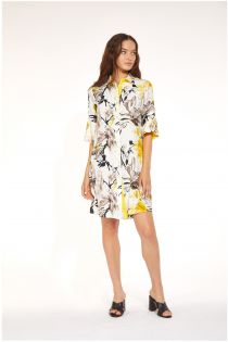 Chemisier in tessuto di viscosa stampato. Sottili contrasti cromatici decorano l'abbottonatura mentre le maniche con ruches al fondo donando brio e leggerezza