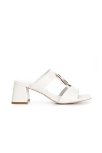 Ciabatta con doppia fascia e accessorio in metallo a decoro. il soletto imbottito in vera pelle fa risultare la calzatura comoda anche dopo svariate ore di utilizzo. il tacco è di 6 cm.
