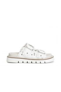 Ciabatta in tessuto denim con doppia fibbia. la tomaia è arricchita da borchie e strass. la zeppa è alta 2.9 cm. una calzatura che unisce stile praticità e versatilità. calzature perfette per l'estata da indossare con gonne lunghe e ampie.