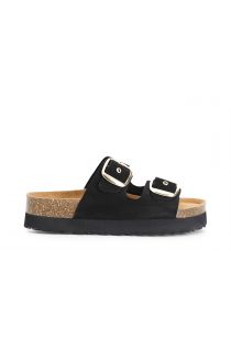 Ciabatta donna in pelle con doppia fibbia. comodo fussbett pelle alto 4 cm.