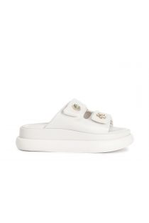Ciabatta in pelle due fasce con velcro e bottoni gioiello. la fodera e il soletto sono in pelle. la zeppa è alta 4.5 cm. calzature perfette per ogni situazione. ideali per le tue avventure in spiaggia ma anche per una passeggiata in città. combinazione perfetta tra eleganza e praticità.