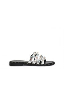 Ciabatta multilistini con cabochon. fodera e soletto sono in pelle. il tacco è alto 2 cm. comodi da indossare e facili da abbinare.