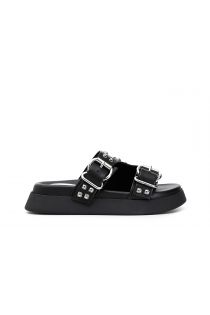 Ciabatte con doppia fibbia in pelle con borchie squadrate sfaccettate, comodo footbed e suola alta in micro.