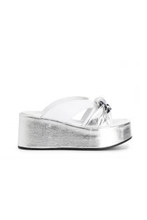 Ciabatte laminate in pelle bicolor su zeppa con accessorio catena.