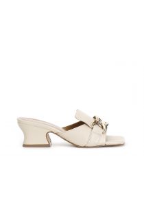 Ciabatta in pelle con accessorio catena dorata e tacco a rocchetto bold.