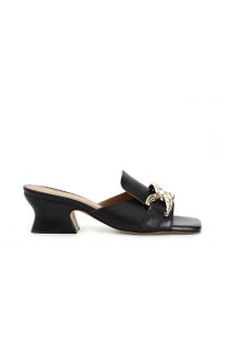 Ciabatta in pelle con accessorio catena dorata e tacco a rocchetto bold.