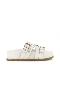 Ciabatte donna in pelle con multilistini decorati da borchie dorate. fodera e soletto in pelle per un comfort superiore. suola platform da 4.8 cm ideali per look urbani e di tendenza.