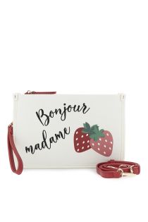 Clutch da donna in canvas con dettagli in materiale effetto nappa. il design strutturato è valorizzato dalla stampa frontale con scritta e motivo grafico che aggiunge un tocco giocoso e distintivo. dotata di zip a contrasto manigliotto e tracolla removibile per un uso versatile giorno e sera. dimensioni: 28.5 cm (lunghezza) × 18 cm (altezza) × 6 cm (profondità)