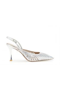 Elegante décolleté slingback dal finish bronzo o argento caratterizzata da fodera e soletto pelle e una tomaia intrecciata a listini sottili e punta affusolata. il tacco slanciato di 8.5 cm dona femminilità e rende questa scarpa perfetta per look raffinati e d’impatto.