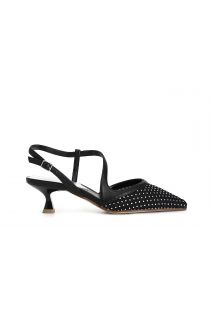 Décolleté effetto laminato aperte dietro caratterizzata da una retina decorata a strass. cinturino sul retro e scollatura asimmetrica. forma sfilata. tacco a rocchetto alto 45mm. calzatura alla moda ma indossabile anche nel quotidiano per soddisfare le esigenze di uno stile di vita dinamico.
