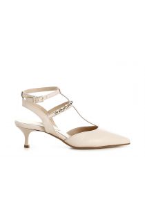 Dècollète con gabbia che cinge la caviglia realizzata in nuance color block con inserto gioiello a catena sul davanti. fibbia e tacchetto medio.