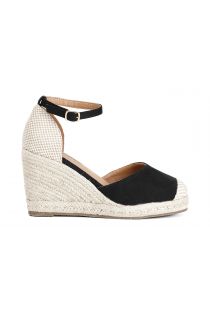 Sandali in microfibra su zeppa in corda di 10.5 cm e plateau di 3.5 cm . cinturino alla caviglia. soletto in pelle. calzatura chiusa davanti e dietro. borchie dorate sul toppone e sul cinturino.