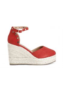 Sandali in microfibra su zeppa in corda di 10.5 cm e plateau di 3.5 cm . cinturino alla caviglia. soletto in pelle. calzatura chiusa davanti e dietro. borchie dorate sul toppone e sul cinturino.