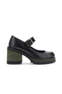 Décolleté in pelle nera con cinturino e fibbia regolabile. suola con battistrada e tacco largo a contrasto alto 9 cm. fodera e soletto in pelle. design grintoso e contemporaneo.