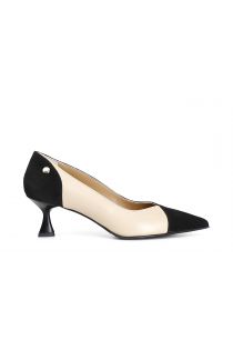 Décolleté da donna bicolor in pelle scamosciata e nappa dallo stile elegante e femminile. tacco a rocchetto altezza 65mm. soletto in morbida pelle.
