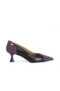 décolleté in pelle scamosciata e nappa bicolor viola/nero