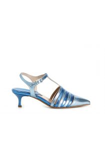 dècollète in similpelle laminata con fasce laterali e fibbia multi azzurro