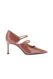 Décolleté in vernice dallo stile elegante e femminile. calzatura arricchita da doppio cinturino e fibbia. tacco fine alto 87 mm. forma sfilata. fodera e soletto sono in pelle.