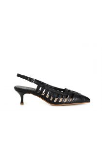 Dècollète total black con fasce laterali che donano un delicato effetto vedo non vedo. fibbia e tacchetto medio.