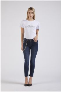 Jeans in tela denim super stretch dalla vestibilità skinny. arricchisce il capo una ricercata catena gioiello personalizzata.