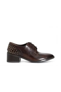 Scarpa derby da donna allacciata. la tomaia è in pelle ed è arricchita da borchie sul toppone. altezza tacco 50mm. il soletto è in pelle