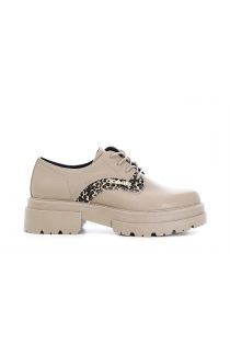 Derby in pelle con riporto cavallino maculato. Battistrada ondulato e allacciatura sottile.