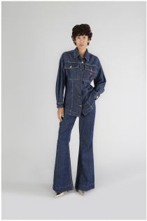 Field jacket in tela denim slegata. spilla removibile e maniche lunghe. capo perfetto per chi si sente indipendenti e alla moda e che ama sperimentare ed essere sempre chic e originali.