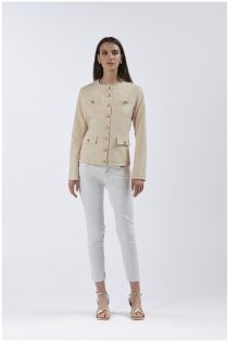 Giacca girocollo in similpelle molto femminile. tasche e chiusura con bottoni dorati personalizzati.