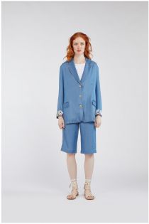 Giacca sfoderata in tencel effetto jeans valorizzata da contrasti di tessuto fantasia.