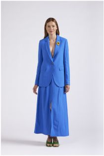 Giacca monopetto realizzata in un fresco tessuto misto lino. la giacca è impreziosita da un delicato accessorio removibile a forma di fiore lavorato a crochet. chiusura con un bottone dotato e tasche a filetto con pattina.