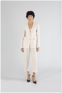 Giacca monopetto sfoderata realizzata in tessuto lino gessato. chiusura con un bottone e tasche a filetto con pattina. completa il look con top e di pantaloni in coordinato. il tessuto leggero accompagna i tuoi look per tutta la stagione primavera-estate.