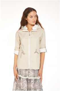 Giaccone reversibile in popeline di cotone con campio cappuccio, maniche a campana con risvolto in contrasto e tasche laterali