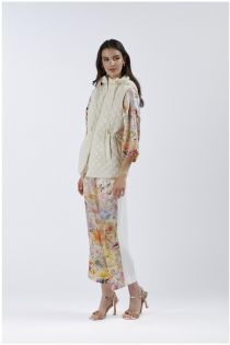 Gilet imbottito smanicato con pratico cappuccio. il capo è realizzato in un nylon impalpabile dalla finitura opaca con trapuntatura a rombi. elastico in vita.