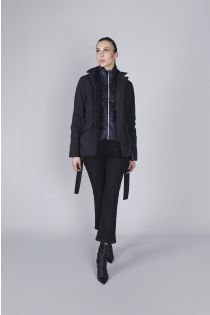 Giubbino imbottito monopetto bimateriale con cintura da annodare tipo trench e pettorina interna staccabile in nylon cangiante. perfetto per look casual e confortevoli.vestibilità regolare. la modella è alta 173 cm e indossa la taglia s.